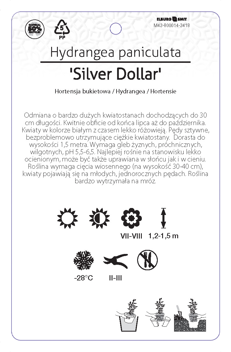 Etykieta zawieszana z gumką w rozmiarze 92×145 mm. Wykonana z polipropylenu o grubości 0,5 mm w 50% pochodzącego z recyklingu. Etykieta odporna na działanie czynników atmosferycznych. Całość dodatkowo zabezpieczona jest lakierem UV zapobiegającym utracie kolorów.