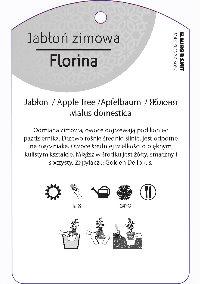 Etykieta zawieszana z gumką w rozmiarze 75×119 mm. Wykonana z polipropylenu o grubości 0,5 mm w 50% pochodzącego z recyklingu. Etykieta odporna na działanie czynników atmosferycznych. Całość dodatkowo zabezpieczona jest lakierem UV zapobiegającym utracie kolorów.