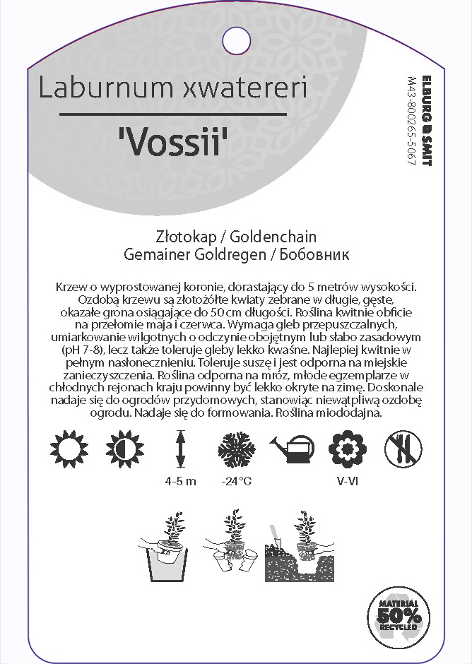 Etykieta zawieszana z gumką w rozmiarze 75×119 mm. Wykonana z polipropylenu o grubości 0,5 mm w 50% pochodzącego z recyklingu. Etykieta odporna na działanie czynników atmosferycznych. Całość dodatkowo zabezpieczona jest lakierem UV zapobiegającym utracie kolorów.