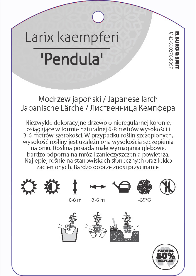 Etykieta zawieszana z gumką w rozmiarze 75×119 mm. Wykonana z polipropylenu o grubości 0,5 mm w 50% pochodzącego z recyklingu. Etykieta odporna na działanie czynników atmosferycznych. Całość dodatkowo zabezpieczona jest lakierem UV zapobiegającym utracie kolorów.