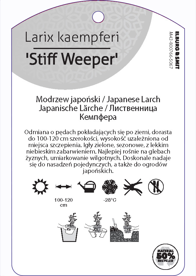 Etykieta zawieszana z gumką w rozmiarze 75×119 mm. Wykonana z polipropylenu o grubości 0,5 mm w 50% pochodzącego z recyklingu. Etykieta odporna na działanie czynników atmosferycznych. Całość dodatkowo zabezpieczona jest lakierem UV zapobiegającym utracie kolorów.