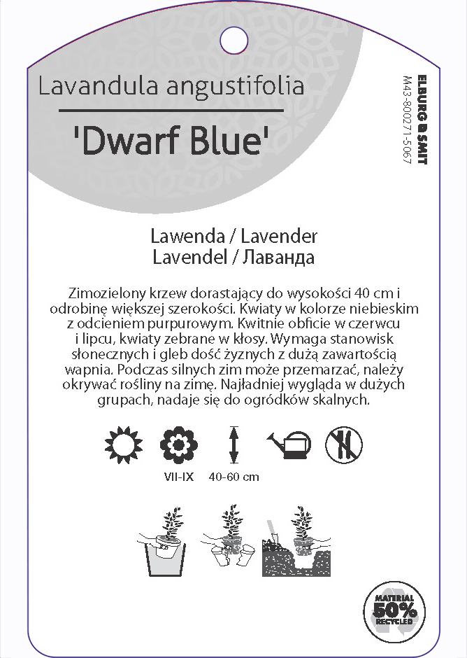 Etykieta zawieszana z gumką w rozmiarze 75×119 mm. Wykonana z polipropylenu o grubości 0,5 mm w 50% pochodzącego z recyklingu. Etykieta odporna na działanie czynników atmosferycznych. Całość dodatkowo zabezpieczona jest lakierem UV zapobiegającym utracie kolorów.