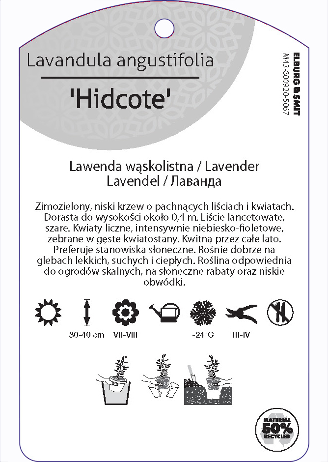Etykieta zawieszana z gumką w rozmiarze 75×119 mm. Wykonana z polipropylenu o grubości 0,5 mm w 50% pochodzącego z recyklingu. Etykieta odporna na działanie czynników atmosferycznych. Całość dodatkowo zabezpieczona jest lakierem UV zapobiegającym utracie kolorów.