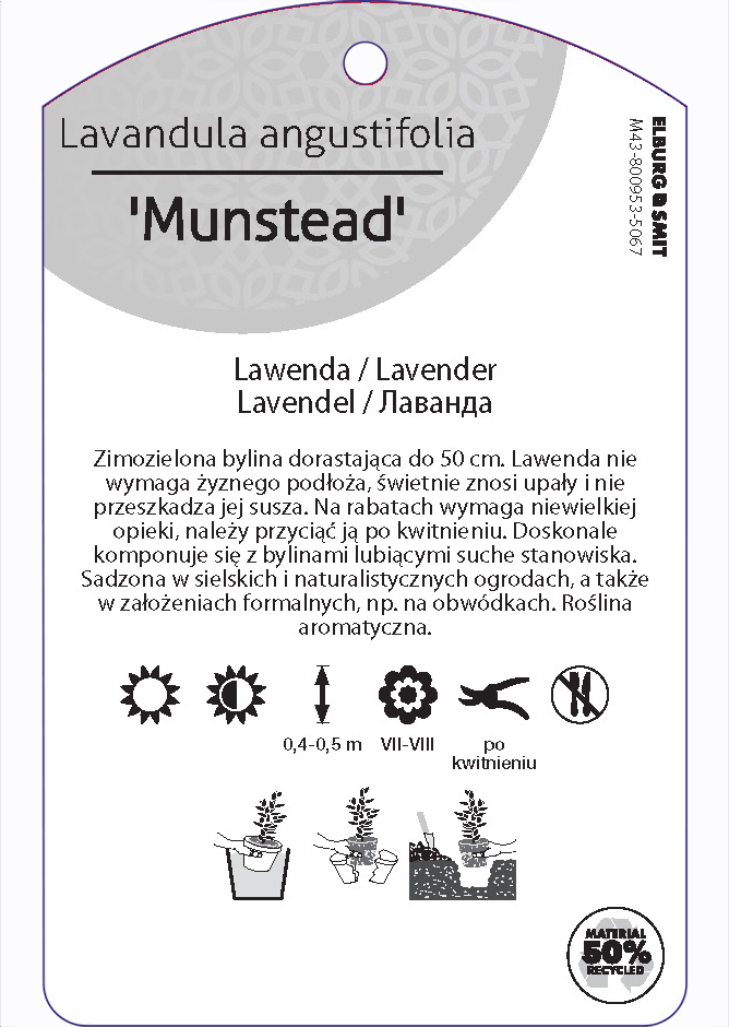 Etykieta zawieszana z gumką w rozmiarze 75×119 mm. Wykonana z polipropylenu o grubości 0,5 mm w 50% pochodzącego z recyklingu. Etykieta odporna na działanie czynników atmosferycznych. Całość dodatkowo zabezpieczona jest lakierem UV zapobiegającym utracie kolorów.
