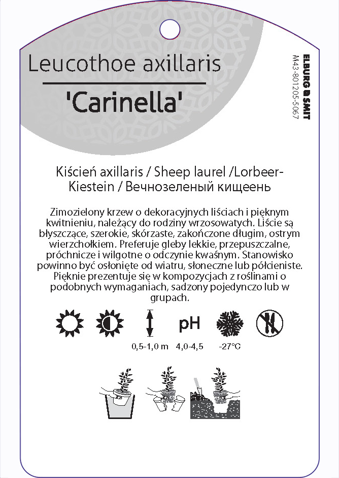 Etykieta zawieszana z gumką w rozmiarze 75×119 mm. Wykonana z polipropylenu o grubości 0,5 mm w 50% pochodzącego z recyklingu. Etykieta odporna na działanie czynników atmosferycznych. Całość dodatkowo zabezpieczona jest lakierem UV zapobiegającym utracie kolorów.