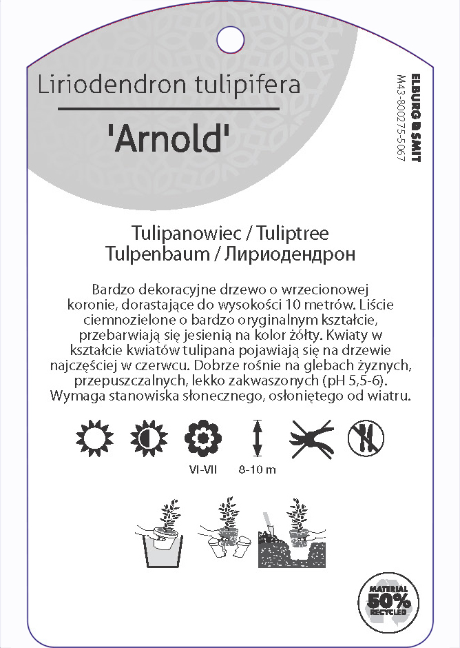 Etykieta zawieszana z gumką w rozmiarze 75×119 mm. Wykonana z polipropylenu o grubości 0,5 mm w 50% pochodzącego z recyklingu. Etykieta odporna na działanie czynników atmosferycznych. Całość dodatkowo zabezpieczona jest lakierem UV zapobiegającym utracie kolorów.