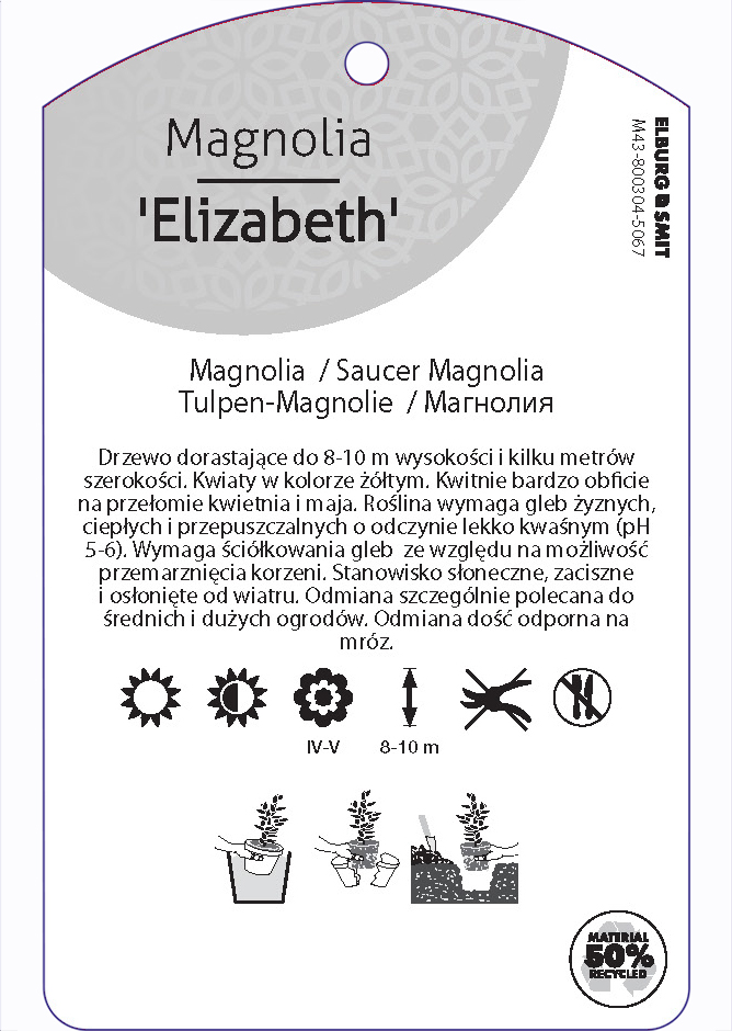 Etykieta zawieszana z gumką w rozmiarze 75×119 mm. Wykonana z polipropylenu o grubości 0,5 mm w 50% pochodzącego z recyklingu. Etykieta odporna na działanie czynników atmosferycznych. Całość dodatkowo zabezpieczona jest lakierem UV zapobiegającym utracie kolorów.