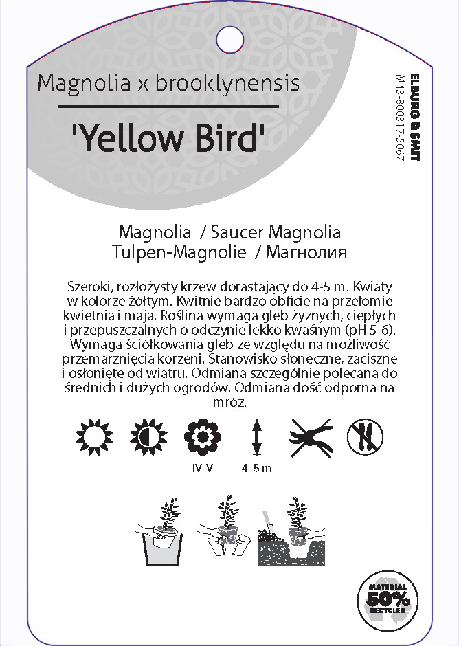 Etykieta zawieszana z gumką w rozmiarze 75×119 mm. Wykonana z polipropylenu o grubości 0,5 mm w 50% pochodzącego z recyklingu. Etykieta odporna na działanie czynników atmosferycznych. Całość dodatkowo zabezpieczona jest lakierem UV zapobiegającym utracie kolorów.