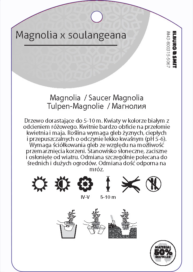 Etykieta zawieszana z gumką w rozmiarze 75×119 mm. Wykonana z polipropylenu o grubości 0,5 mm w 50% pochodzącego z recyklingu. Etykieta odporna na działanie czynników atmosferycznych. Całość dodatkowo zabezpieczona jest lakierem UV zapobiegającym utracie kolorów.