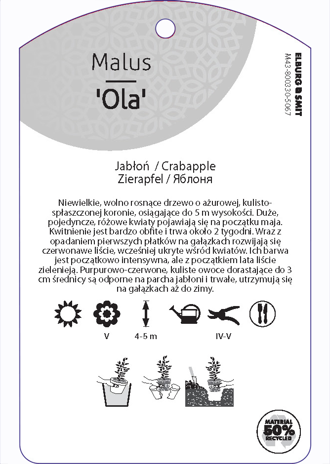 Etykieta zawieszana z gumką w rozmiarze 75×119 mm. Wykonana z polipropylenu o grubości 0,5 mm w 50% pochodzącego z recyklingu. Etykieta odporna na działanie czynników atmosferycznych. Całość dodatkowo zabezpieczona jest lakierem UV zapobiegającym utracie kolorów.