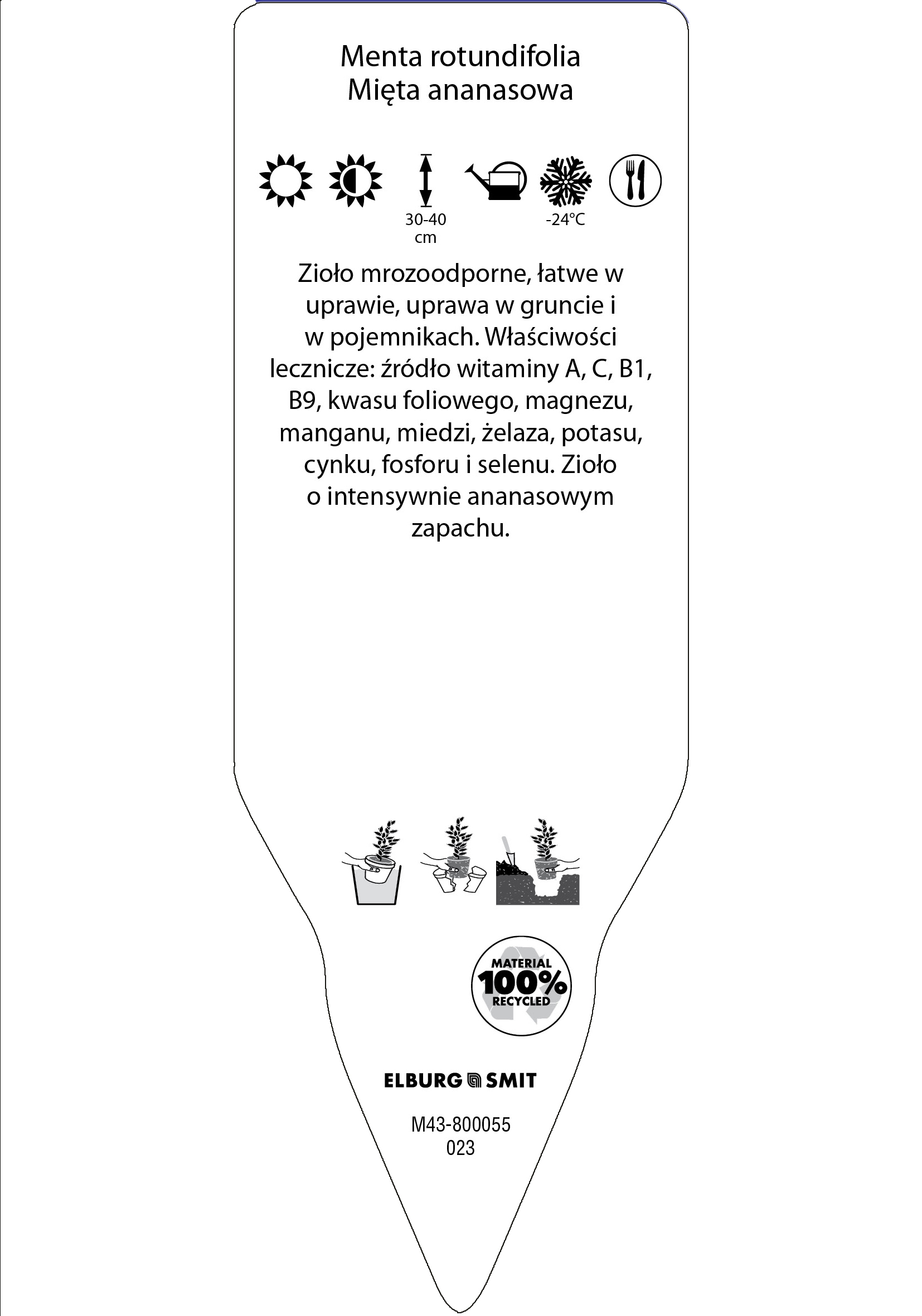 Etykieta wtykana w rozmiarze 35×100 mm. Wykonana z polistyrenu o grubości 0,6 mm w 100% pochodzącego z recyklingu. Etykieta odporna na działanie czynników atmosferycznych. Całość dodatkowo zabezpieczona jest lakierem UV zapobiegającym utracie kolorów.