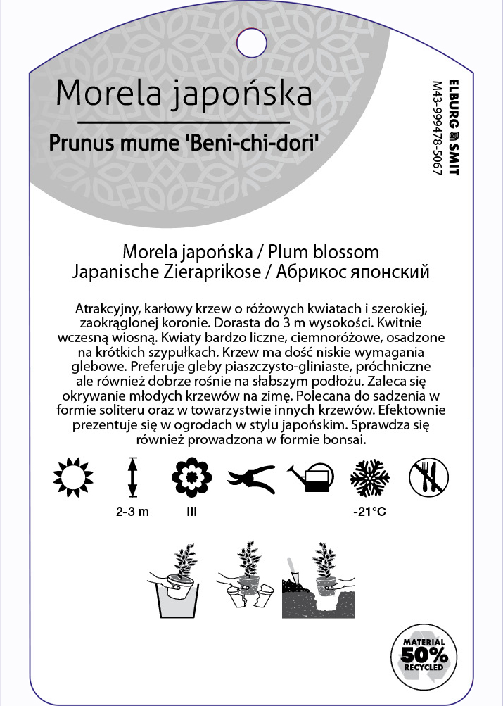 Etykieta zawieszana z gumką w rozmiarze 75×119 mm. Wykonana z polipropylenu o grubości 0,5 mm w 50% pochodzącego z recyklingu. Etykieta odporna na działanie czynników atmosferycznych. Całość dodatkowo zabezpieczona jest lakierem UV zapobiegającym utracie kolorów.