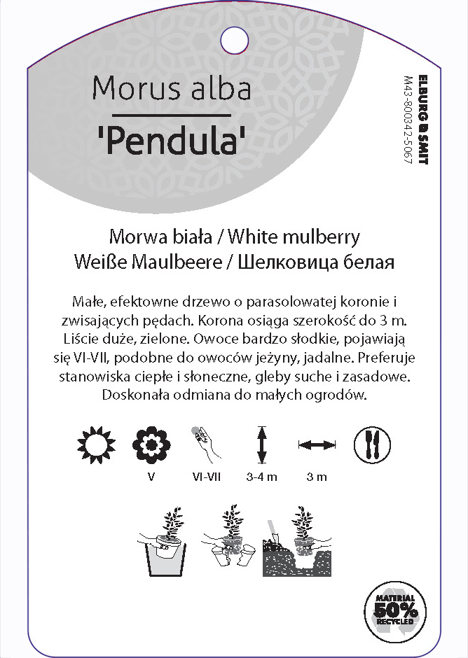 Etykieta zawieszana z gumką w rozmiarze 75×119 mm. Wykonana z polipropylenu o grubości 0,5 mm w 50% pochodzącego z recyklingu. Etykieta odporna na działanie czynników atmosferycznych. Całość dodatkowo zabezpieczona jest lakierem UV zapobiegającym utracie kolorów.