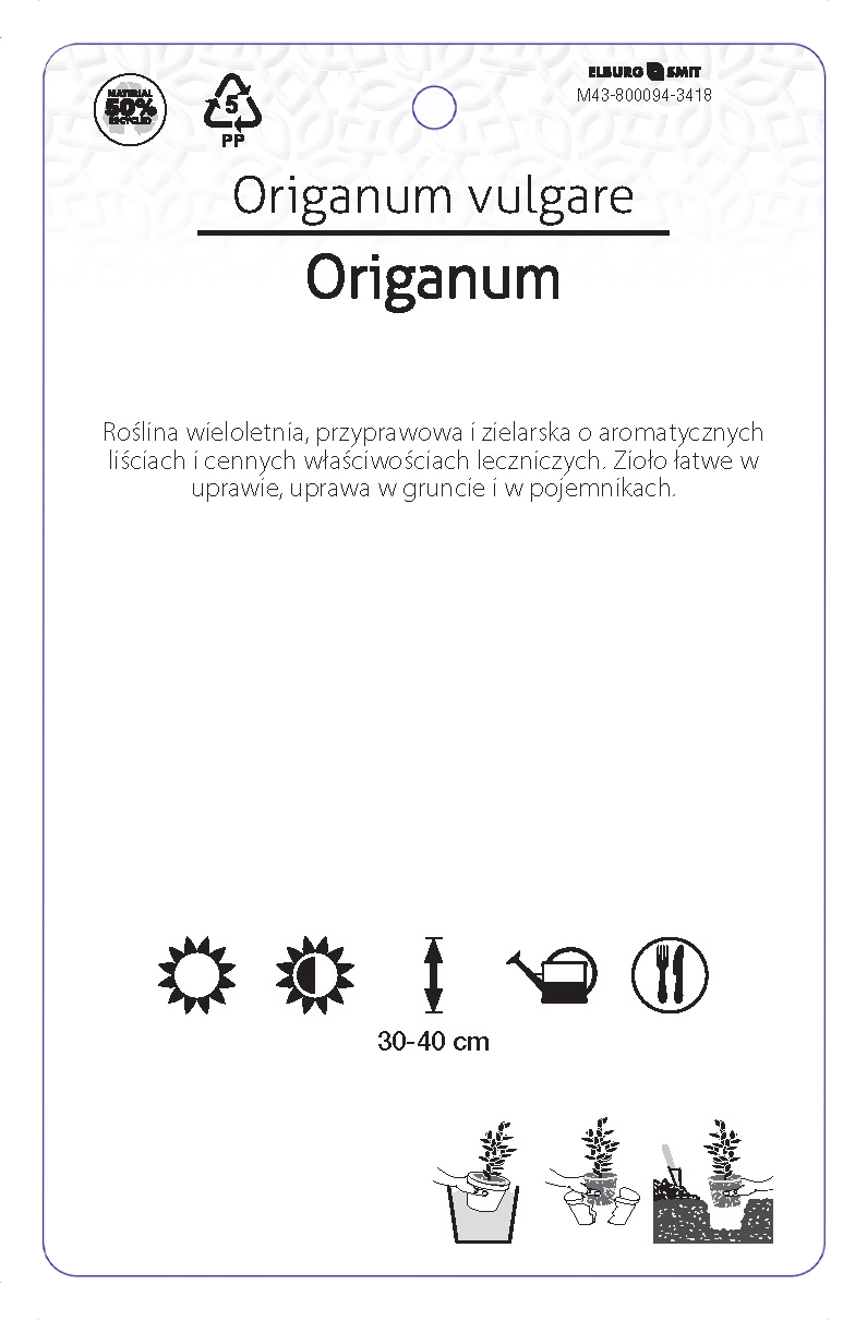 Etykieta zawieszana z gumką w rozmiarze 92×145 mm. Wykonana z polipropylenu o grubości 0,5 mm w 50% pochodzącego z recyklingu. Etykieta odporna na działanie czynników atmosferycznych. Całość dodatkowo zabezpieczona jest lakierem UV zapobiegającym utracie kolorów.