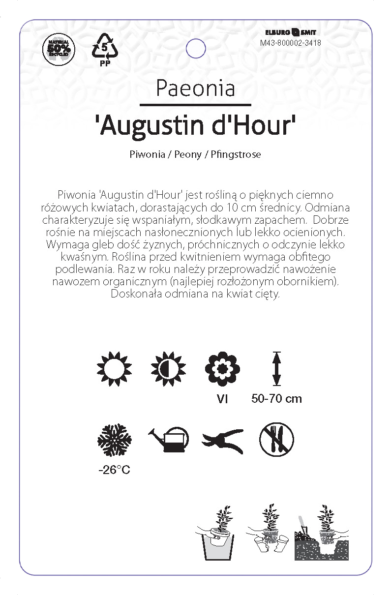 Etykieta zawieszana z gumką w rozmiarze 92×145 mm. Wykonana z polipropylenu o grubości 0,5 mm w 50% pochodzącego z recyklingu. Etykieta odporna na działanie czynników atmosferycznych. Całość dodatkowo zabezpieczona jest lakierem UV zapobiegającym utracie kolorów.