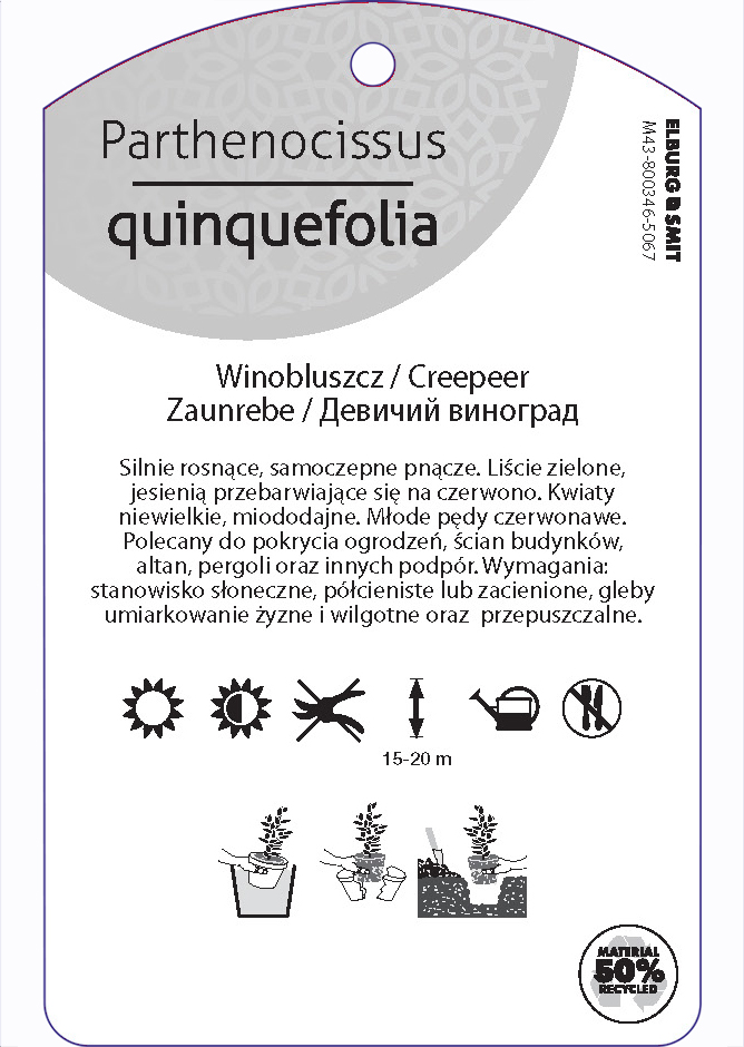 Etykieta zawieszana z gumką w rozmiarze 75×119 mm. Wykonana z polipropylenu o grubości 0,5 mm w 50% pochodzącego z recyklingu. Etykieta odporna na działanie czynników atmosferycznych. Całość dodatkowo zabezpieczona jest lakierem UV zapobiegającym utracie kolorów.
