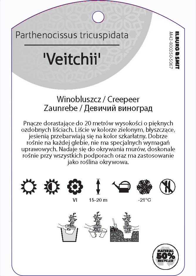 Etykieta zawieszana z gumką w rozmiarze 75×119 mm. Wykonana z polipropylenu o grubości 0,5 mm w 50% pochodzącego z recyklingu. Etykieta odporna na działanie czynników atmosferycznych. Całość dodatkowo zabezpieczona jest lakierem UV zapobiegającym utracie kolorów.
