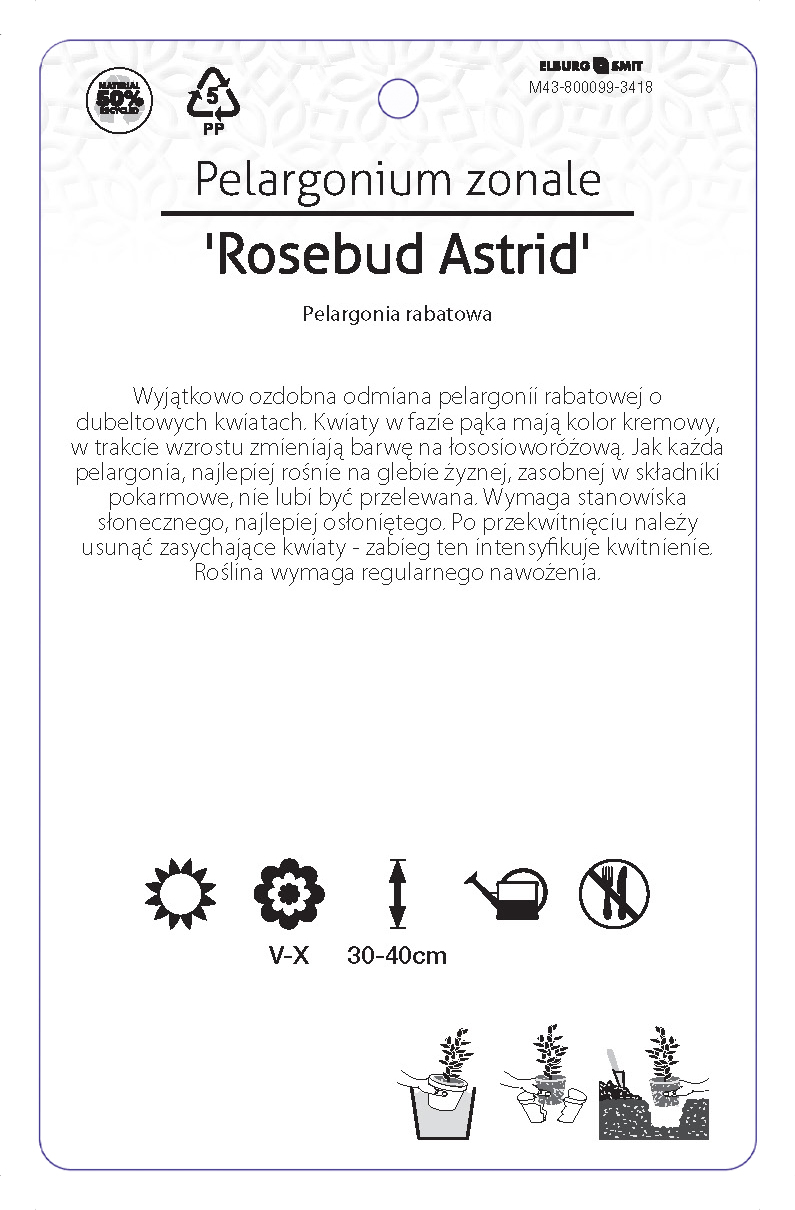 Etykieta zawieszana z gumką w rozmiarze 92×145 mm. Wykonana z polipropylenu o grubości 0,5 mm w 50% pochodzącego z recyklingu. Etykieta odporna na działanie czynników atmosferycznych. Całość dodatkowo zabezpieczona jest lakierem UV zapobiegającym utracie kolorów.