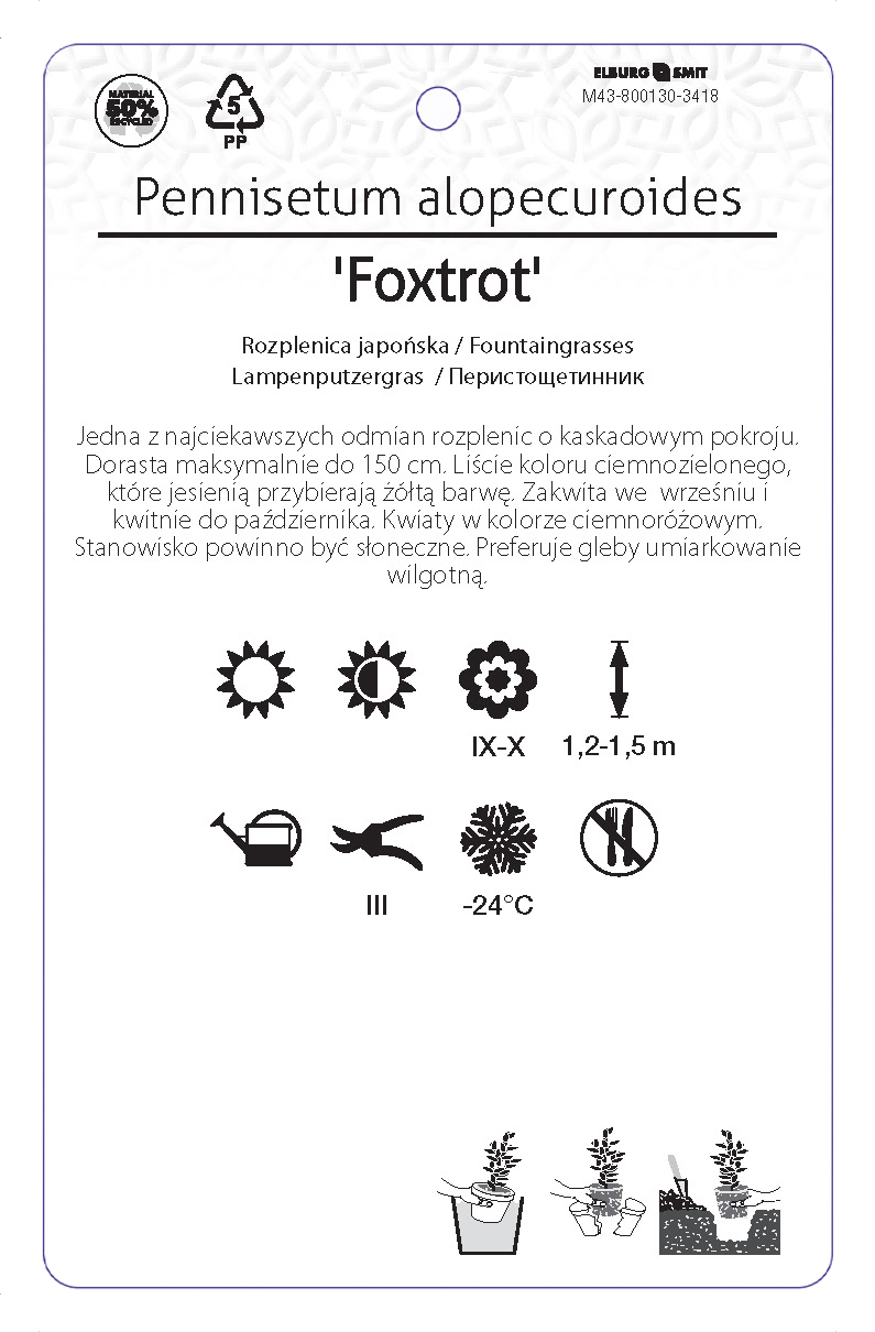 Etykieta zawieszana z gumką w rozmiarze 92×145 mm. Wykonana z polipropylenu o grubości 0,5 mm w 50% pochodzącego z recyklingu. Etykieta odporna na działanie czynników atmosferycznych. Całość dodatkowo zabezpieczona jest lakierem UV zapobiegającym utracie kolorów.