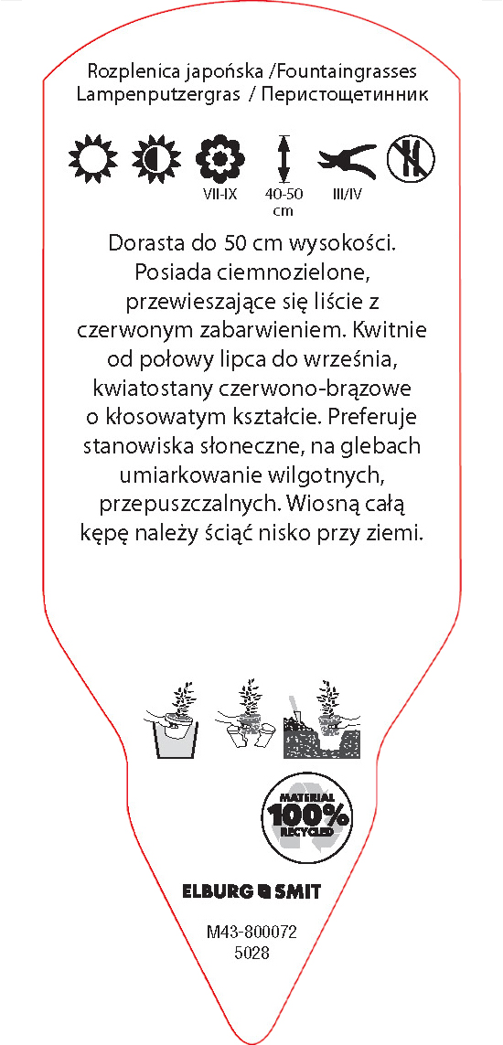 Etykieta wtykana w rozmiarze 58×145 mm. Wykonana z polistyrenu o grubości 0,6 mm w 100% pochodzącego z recyklingu. Etykieta odporna na działanie czynników atmosferycznych. Całość dodatkowo zabezpieczona jest lakierem UV zapobiegającym utracie kolorów.