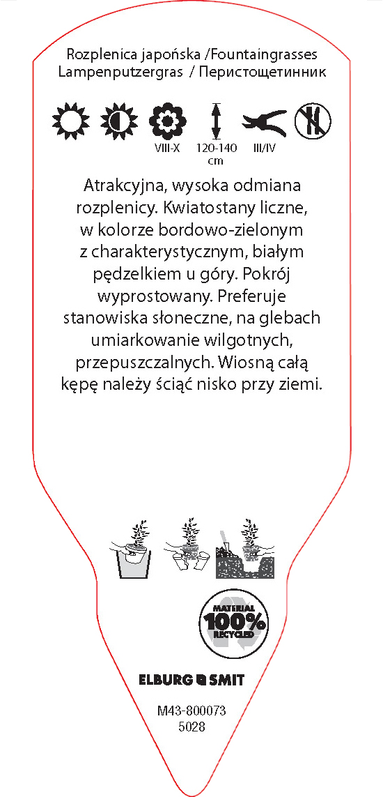 Etykieta wtykana w rozmiarze 58×145 mm. Wykonana z polistyrenu o grubości 0,6 mm w 100% pochodzącego z recyklingu. Etykieta odporna na działanie czynników atmosferycznych. Całość dodatkowo zabezpieczona jest lakierem UV zapobiegającym utracie kolorów.