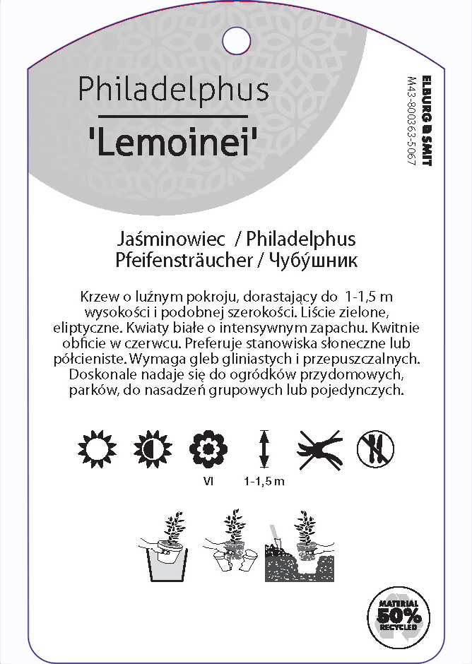 Etykieta zawieszana z gumką w rozmiarze 75×119 mm. Wykonana z polipropylenu o grubości 0,5 mm w 50% pochodzącego z recyklingu. Etykieta odporna na działanie czynników atmosferycznych. Całość dodatkowo zabezpieczona jest lakierem UV zapobiegającym utracie kolorów.