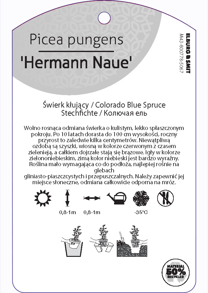 Etykieta zawieszana z gumką w rozmiarze 75×119 mm. Wykonana z polipropylenu o grubości 0,5 mm w 50% pochodzącego z recyklingu. Etykieta odporna na działanie czynników atmosferycznych. Całość dodatkowo zabezpieczona jest lakierem UV zapobiegającym utracie kolorów.