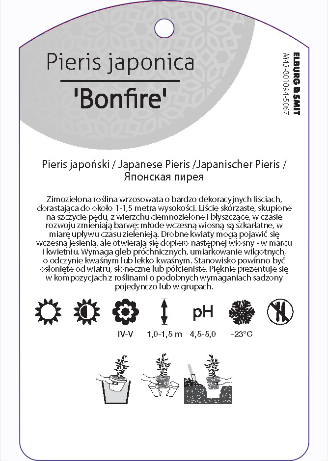 Etykieta zawieszana z gumką w rozmiarze 75×119 mm. Wykonana z polipropylenu o grubości 0,5 mm w 50% pochodzącego z recyklingu. Etykieta odporna na działanie czynników atmosferycznych. Całość dodatkowo zabezpieczona jest lakierem UV zapobiegającym utracie kolorów.