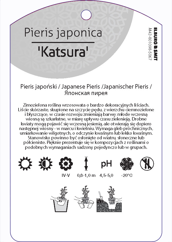 Etykieta zawieszana z gumką w rozmiarze 75×119 mm. Wykonana z polipropylenu o grubości 0,5 mm w 50% pochodzącego z recyklingu. Etykieta odporna na działanie czynników atmosferycznych. Całość dodatkowo zabezpieczona jest lakierem UV zapobiegającym utracie kolorów.