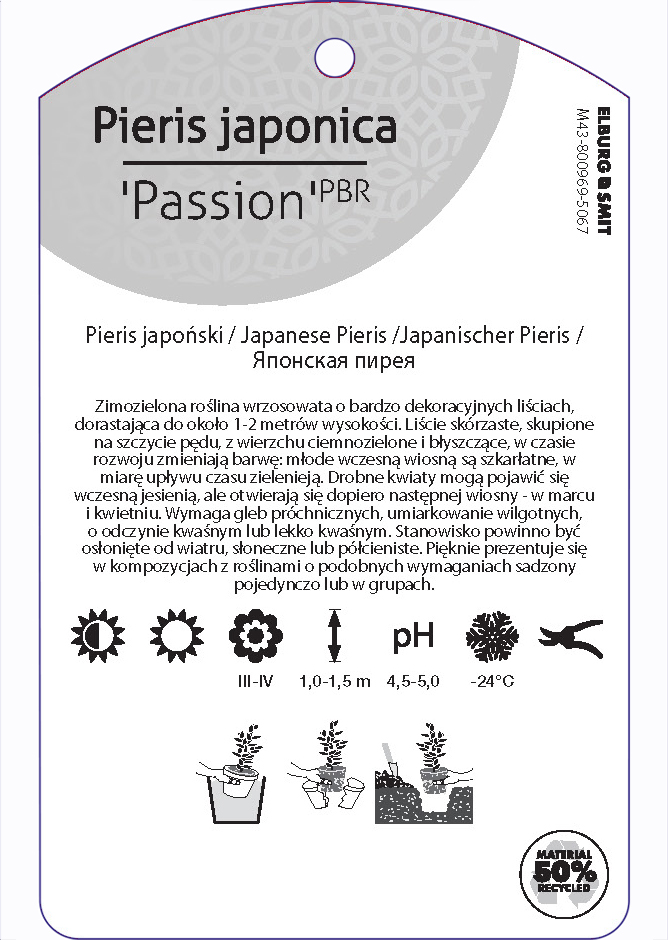 Etykieta zawieszana z gumką w rozmiarze 75×119 mm. Wykonana z polipropylenu o grubości 0,5 mm w 50% pochodzącego z recyklingu. Etykieta odporna na działanie czynników atmosferycznych. Całość dodatkowo zabezpieczona jest lakierem UV zapobiegającym utracie kolorów.