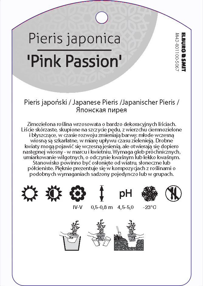 Etykieta zawieszana z gumką w rozmiarze 75×119 mm. Wykonana z polipropylenu o grubości 0,5 mm w 50% pochodzącego z recyklingu. Etykieta odporna na działanie czynników atmosferycznych. Całość dodatkowo zabezpieczona jest lakierem UV zapobiegającym utracie kolorów.