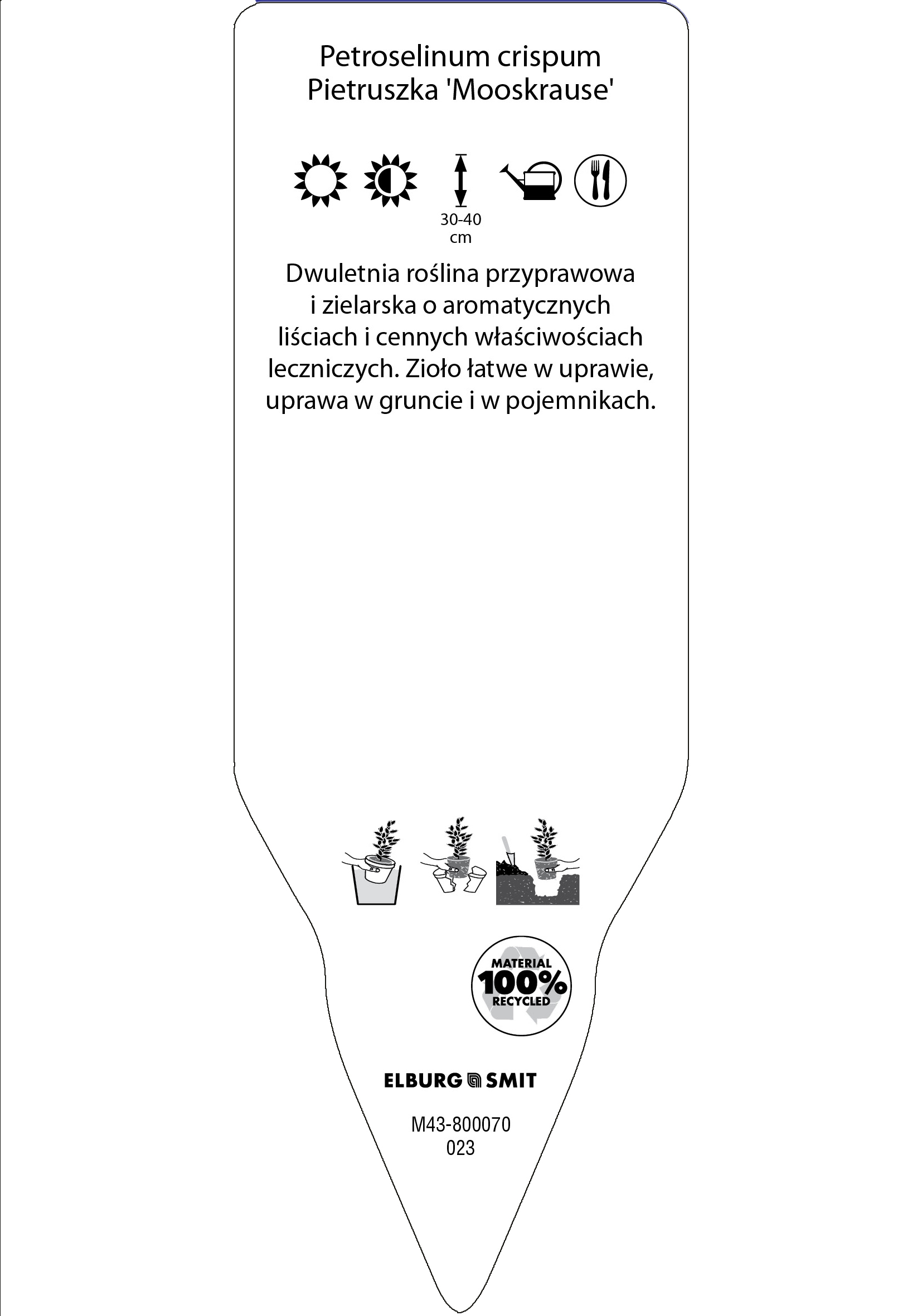 Etykieta wtykana w rozmiarze 35×100 mm. Wykonana z polistyrenu o grubości 0,6 mm w 100% pochodzącego z recyklingu. Etykieta odporna na działanie czynników atmosferycznych. Całość dodatkowo zabezpieczona jest lakierem UV zapobiegającym utracie kolorów.