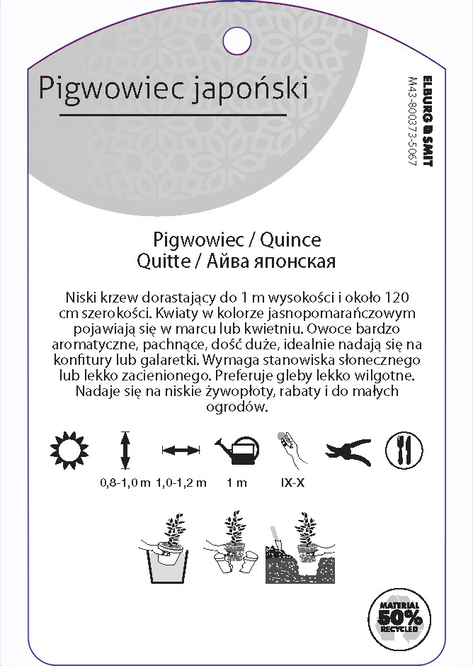 Etykieta zawieszana z gumką w rozmiarze 75×119 mm. Wykonana z polipropylenu o grubości 0,5 mm w 50% pochodzącego z recyklingu. Etykieta odporna na działanie czynników atmosferycznych. Całość dodatkowo zabezpieczona jest lakierem UV zapobiegającym utracie kolorów.