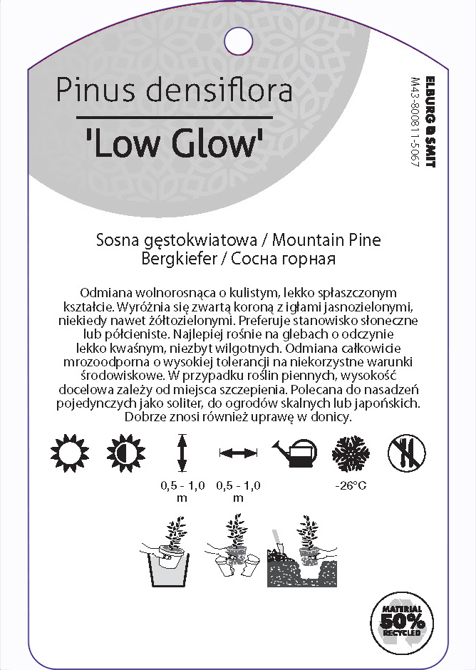 Etykieta zawieszana z gumką w rozmiarze 75×119 mm. Wykonana z polipropylenu o grubości 0,5 mm w 50% pochodzącego z recyklingu. Etykieta odporna na działanie czynników atmosferycznych. Całość dodatkowo zabezpieczona jest lakierem UV zapobiegającym utracie kolorów.