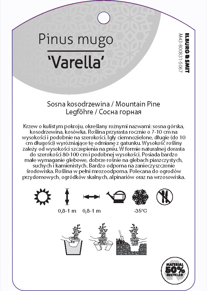 Etykieta zawieszana z gumką w rozmiarze 75×119 mm. Wykonana z polipropylenu o grubości 0,5 mm w 50% pochodzącego z recyklingu. Etykieta odporna na działanie czynników atmosferycznych. Całość dodatkowo zabezpieczona jest lakierem UV zapobiegającym utracie kolorów.