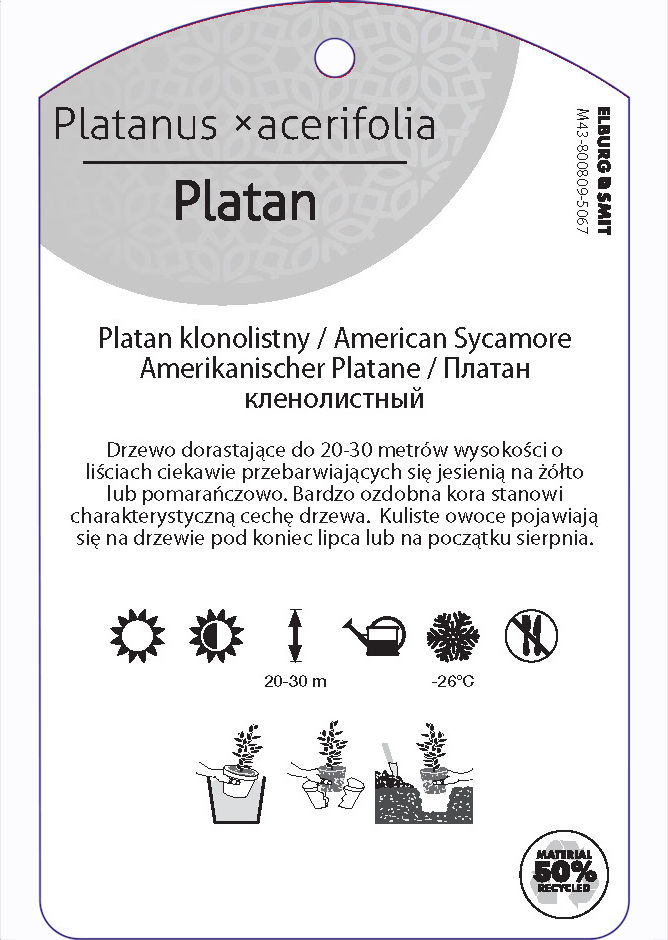 Etykieta zawieszana z gumką w rozmiarze 75×119 mm. Wykonana z polipropylenu o grubości 0,5 mm w 50% pochodzącego z recyklingu. Etykieta odporna na działanie czynników atmosferycznych. Całość dodatkowo zabezpieczona jest lakierem UV zapobiegającym utracie kolorów.