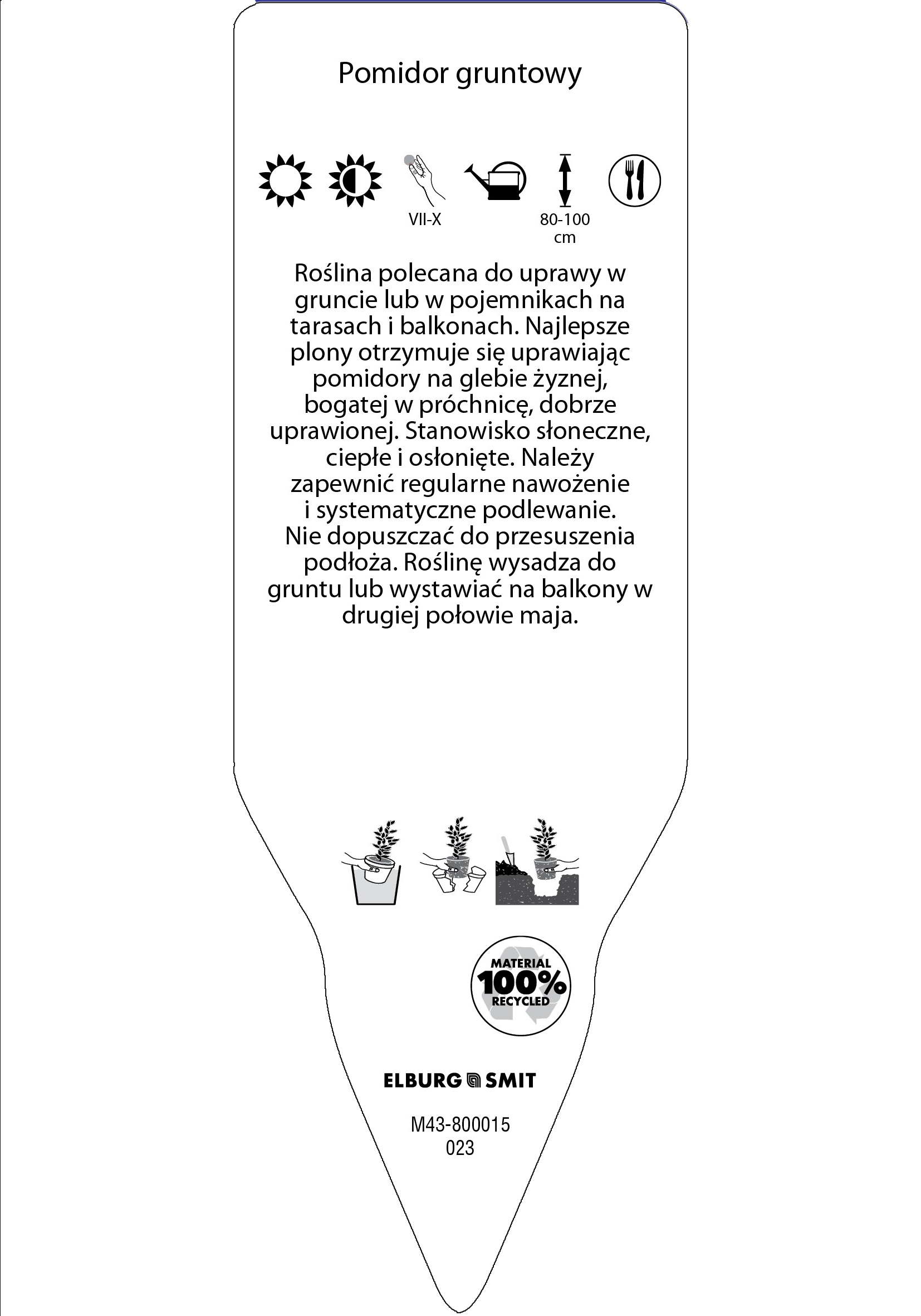 Etykieta wtykana w rozmiarze 35×100 mm. Wykonana z polistyrenu o grubości 0,6 mm w 100% pochodzącego z recyklingu. Etykieta odporna na działanie czynników atmosferycznych. Całość dodatkowo zabezpieczona jest lakierem UV zapobiegającym utracie kolorów.