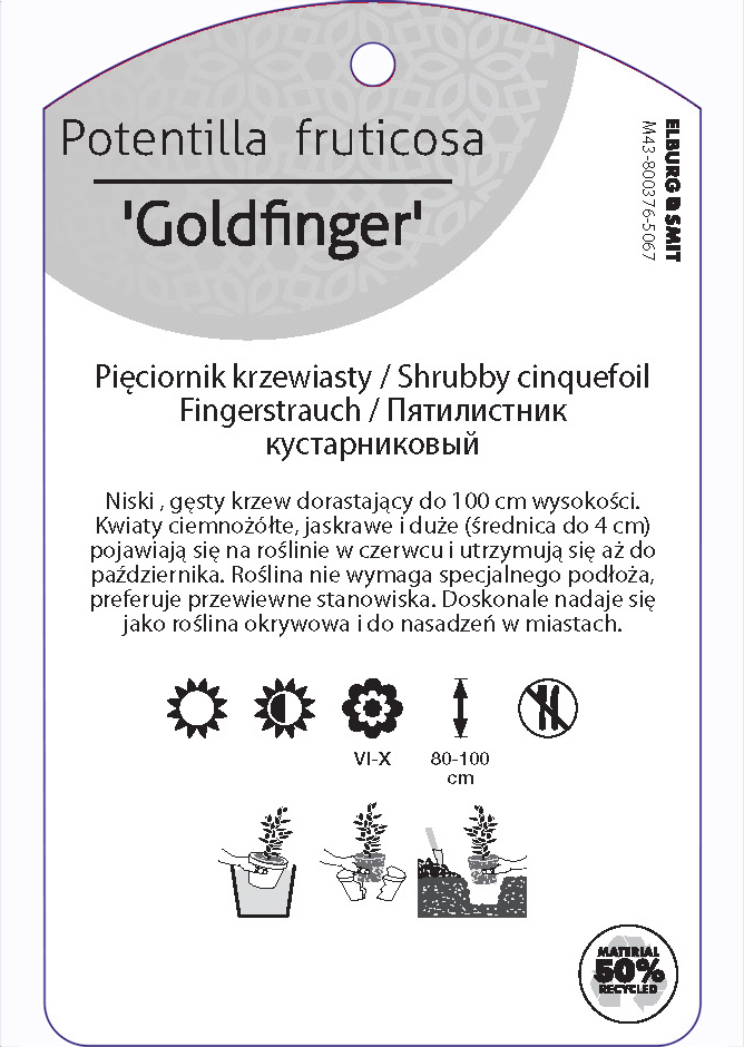 Etykieta zawieszana z gumką w rozmiarze 75×119 mm. Wykonana z polipropylenu o grubości 0,5 mm w 50% pochodzącego z recyklingu. Etykieta odporna na działanie czynników atmosferycznych. Całość dodatkowo zabezpieczona jest lakierem UV zapobiegającym utracie kolorów.