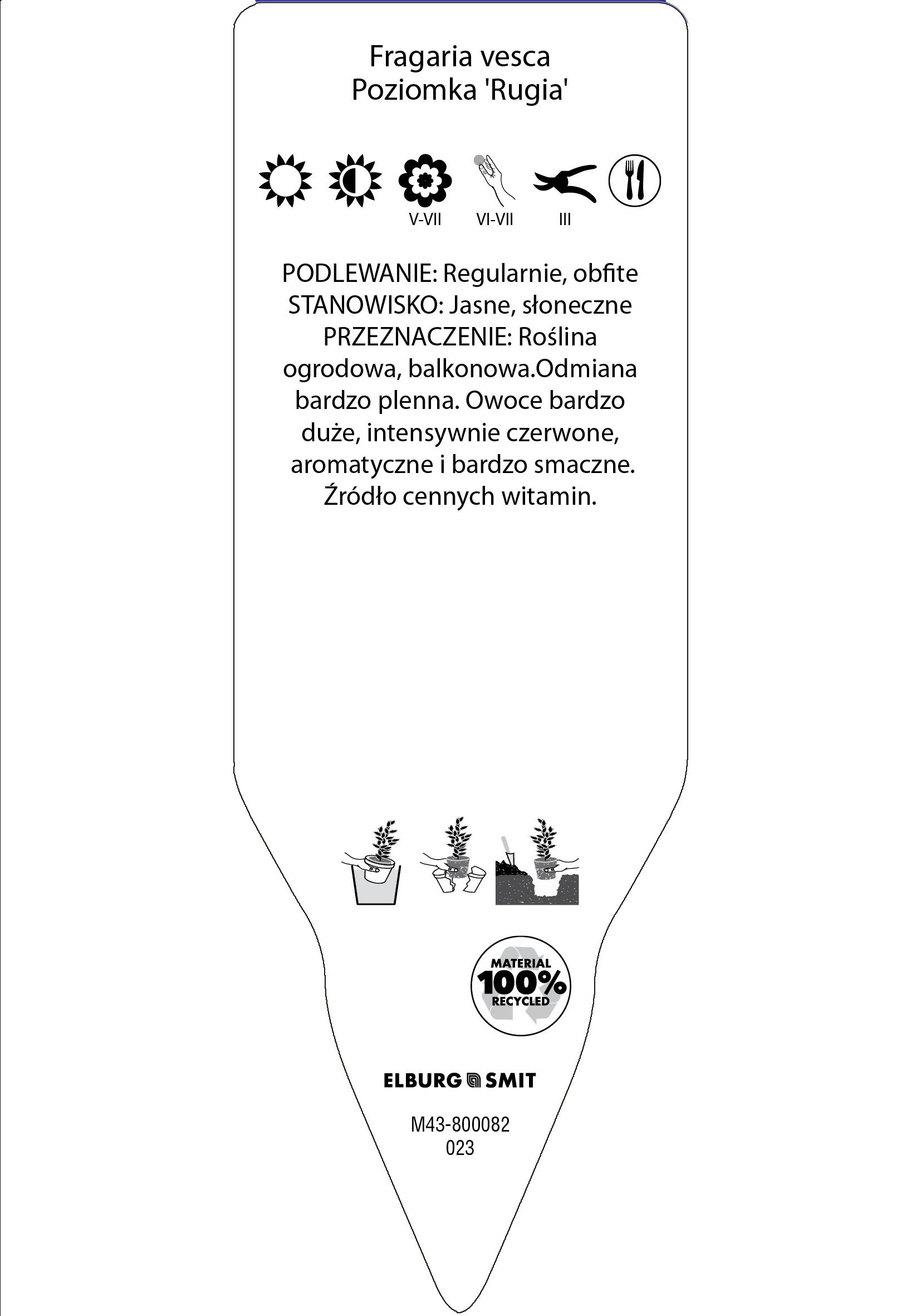 Etykieta wtykana w rozmiarze 35×100 mm. Wykonana z polistyrenu o grubości 0,6 mm w 100% pochodzącego z recyklingu. Etykieta odporna na działanie czynników atmosferycznych. Całość dodatkowo zabezpieczona jest lakierem UV zapobiegającym utracie kolorów.