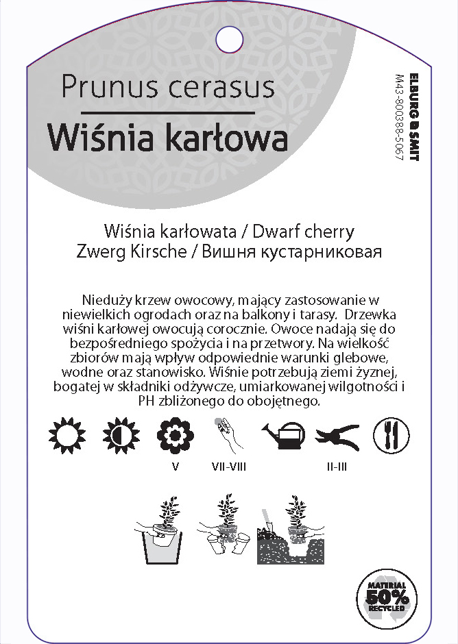 Etykieta zawieszana z gumką w rozmiarze 75×119 mm. Wykonana z polipropylenu o grubości 0,5 mm w 50% pochodzącego z recyklingu. Etykieta odporna na działanie czynników atmosferycznych. Całość dodatkowo zabezpieczona jest lakierem UV zapobiegającym utracie kolorów.