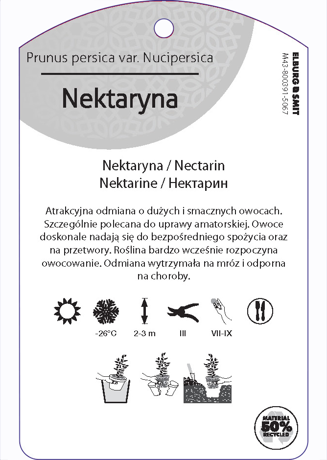 Etykieta zawieszana z gumką w rozmiarze 75×119 mm. Wykonana z polipropylenu o grubości 0,5 mm w 50% pochodzącego z recyklingu. Etykieta odporna na działanie czynników atmosferycznych. Całość dodatkowo zabezpieczona jest lakierem UV zapobiegającym utracie kolorów.