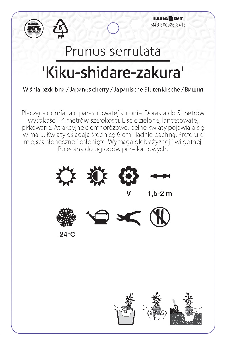 Etykieta zawieszana z gumką w rozmiarze 92×145 mm. Wykonana z polipropylenu o grubości 0,5 mm w 50% pochodzącego z recyklingu. Etykieta odporna na działanie czynników atmosferycznych. Całość dodatkowo zabezpieczona jest lakierem UV zapobiegającym utracie kolorów.