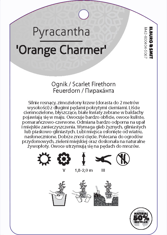 Etykieta zawieszana z dziurką w rozmiarze 75×119 mm. Wykonana z polipropylenu o grubości 0,5 mm w 50% pochodzącego z recyklingu. Etykieta odporna na działanie czynników atmosferycznych. Całość dodatkowo zabezpieczona jest lakierem UV zapobiegającym utracie kolorów.
