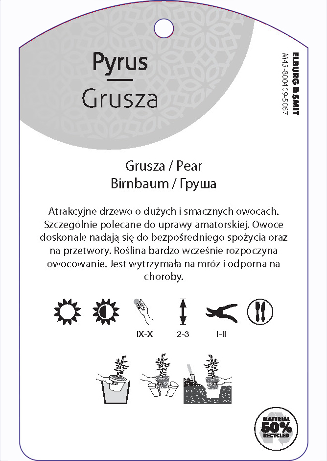 Etykieta zawieszana z gumką w rozmiarze 75×119 mm. Wykonana z polipropylenu o grubości 0,5 mm w 50% pochodzącego z recyklingu. Etykieta odporna na działanie czynników atmosferycznych. Całość dodatkowo zabezpieczona jest lakierem UV zapobiegającym utracie kolorów.