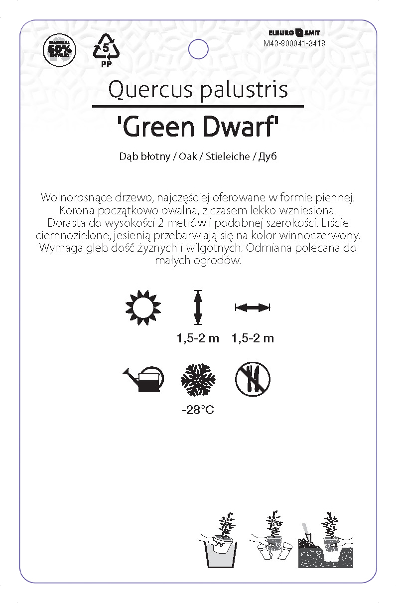 Etykieta zawieszana z gumką w rozmiarze 92×145 mm. Wykonana z polipropylenu o grubości 0,5 mm w 50% pochodzącego z recyklingu. Etykieta odporna na działanie czynników atmosferycznych. Całość dodatkowo zabezpieczona jest lakierem UV zapobiegającym utracie kolorów.