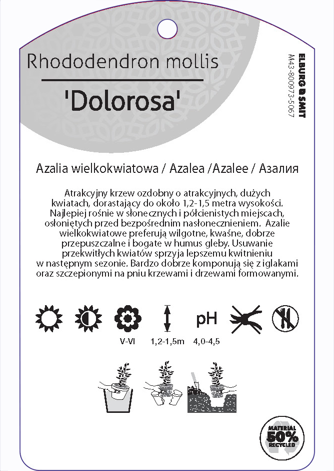 Etykieta zawieszana z gumką w rozmiarze 75×119 mm. Wykonana z polipropylenu o grubości 0,5 mm w 50% pochodzącego z recyklingu. Etykieta odporna na działanie czynników atmosferycznych. Całość dodatkowo zabezpieczona jest lakierem UV zapobiegającym utracie kolorów.