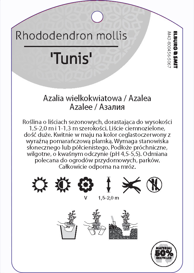 Etykieta zawieszana z gumką w rozmiarze 75×119 mm. Wykonana z polipropylenu o grubości 0,5 mm w 50% pochodzącego z recyklingu. Etykieta odporna na działanie czynników atmosferycznych. Całość dodatkowo zabezpieczona jest lakierem UV zapobiegającym utracie kolorów.