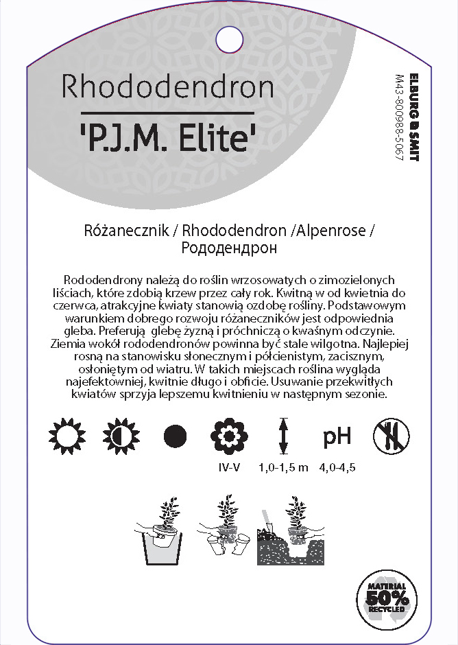 Etykieta zawieszana z gumką w rozmiarze 75×119 mm. Wykonana z polipropylenu o grubości 0,5 mm w 50% pochodzącego z recyklingu. Etykieta odporna na działanie czynników atmosferycznych. Całość dodatkowo zabezpieczona jest lakierem UV zapobiegającym utracie kolorów.