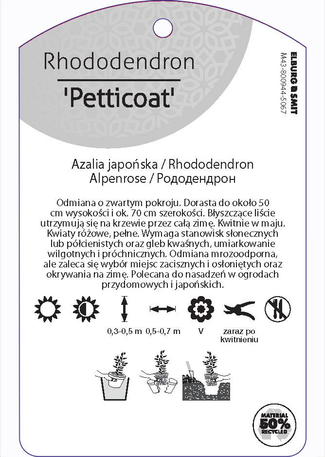 Etykieta zawieszana z gumką w rozmiarze 75×119 mm. Wykonana z polipropylenu o grubości 0,5 mm w 50% pochodzącego z recyklingu. Etykieta odporna na działanie czynników atmosferycznych. Całość dodatkowo zabezpieczona jest lakierem UV zapobiegającym utracie kolorów.