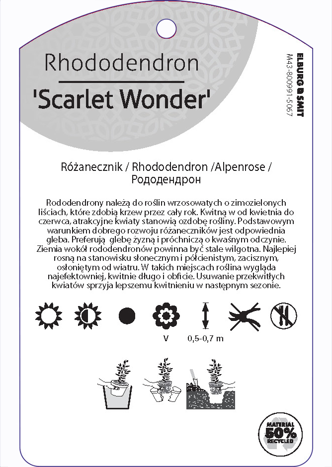 Etykieta zawieszana z gumką w rozmiarze 75×119 mm. Wykonana z polipropylenu o grubości 0,5 mm w 50% pochodzącego z recyklingu. Etykieta odporna na działanie czynników atmosferycznych. Całość dodatkowo zabezpieczona jest lakierem UV zapobiegającym utracie kolorów.